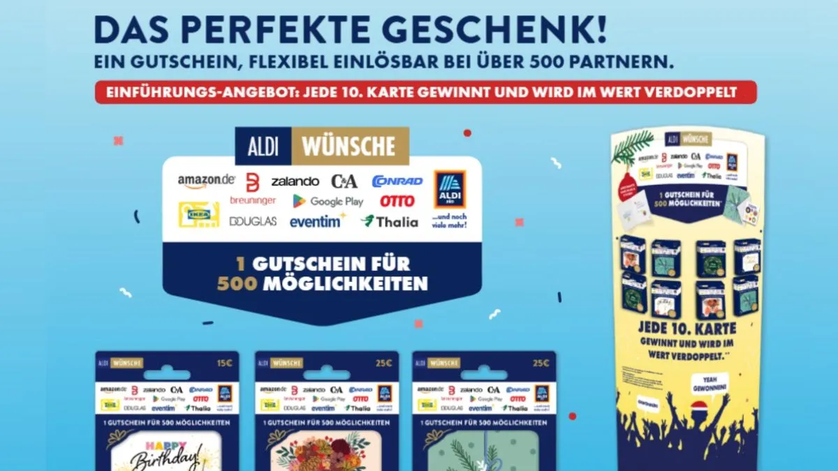 The new ALDI SÜD ALDI WISHES vouchers can be redeemed with around 500 partners through aldi-wuensche.de — including major names in technology, fashion, furniture, sport, and entertainment.
