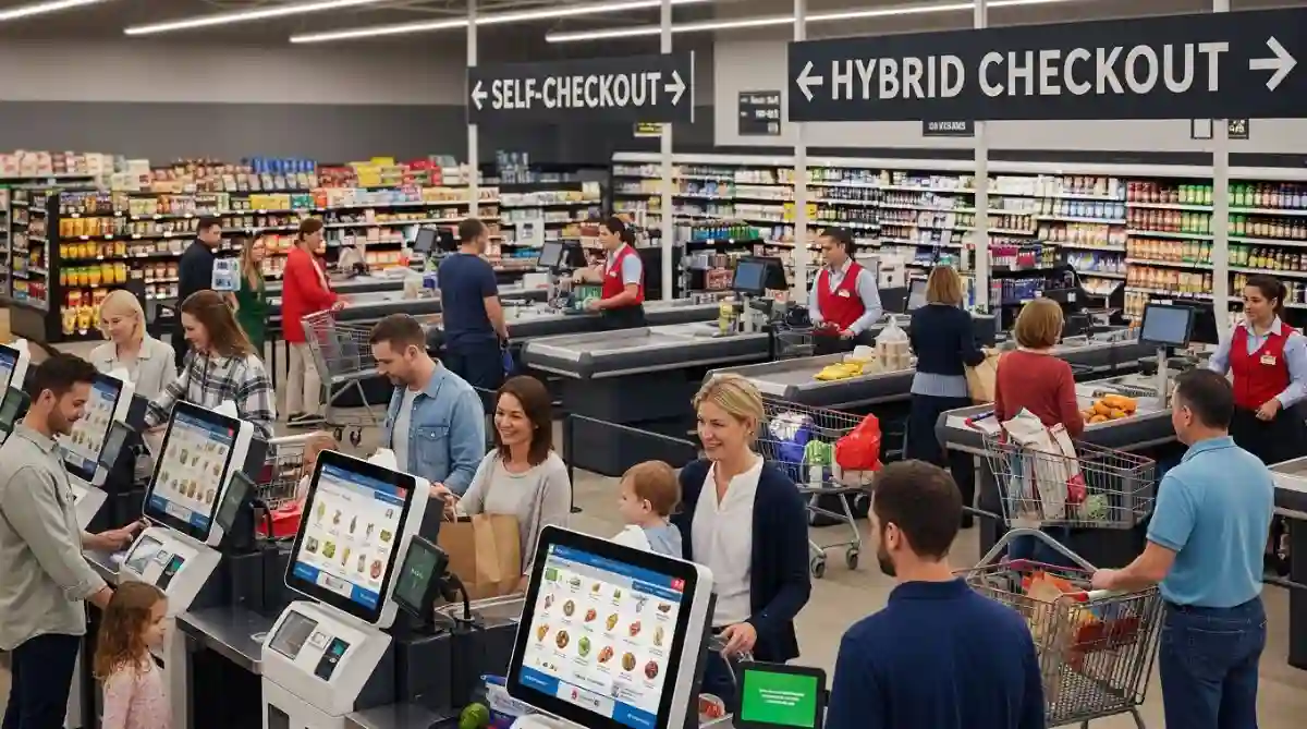Hybrid models now dominate store planning across Europe and North America. These layouts place different checkout modes side by side so shoppers can choose the one that matches their mission.